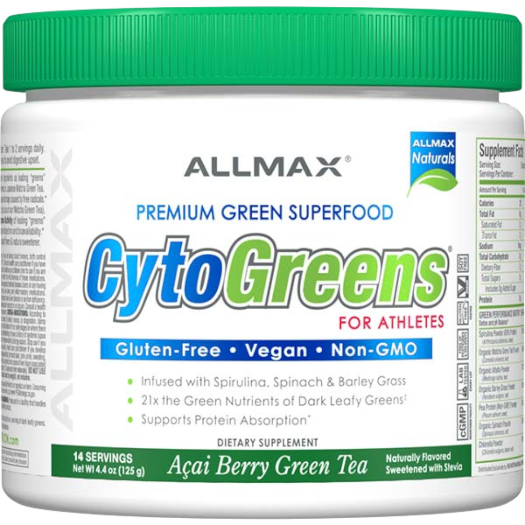 ALLMAX Cytogreens is gluten-free, non-GMO, lecithin-free, and made without artificial colors, flavors, or sweeteners — giving you a pure way to fuel both performance and health.
