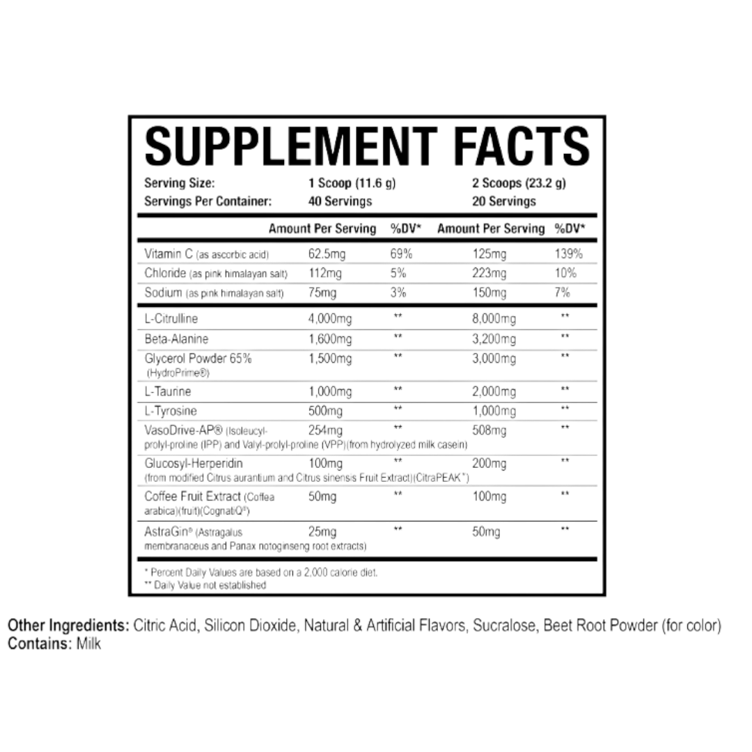 Hydraulic V2 is a fully upgraded pre-workout designed to take your training to the next level. With higher doses of L-Citrulline and Beta-Alanine, plus powerful trademarked ingredients like Vasodrive-AP®, Citrapeak®, Hydroprime®, Cognatiq®, and AstraGin® ... Hydraulic V2 delivers insane pumps, enhanced hydration, improved focus, and next-level performance.