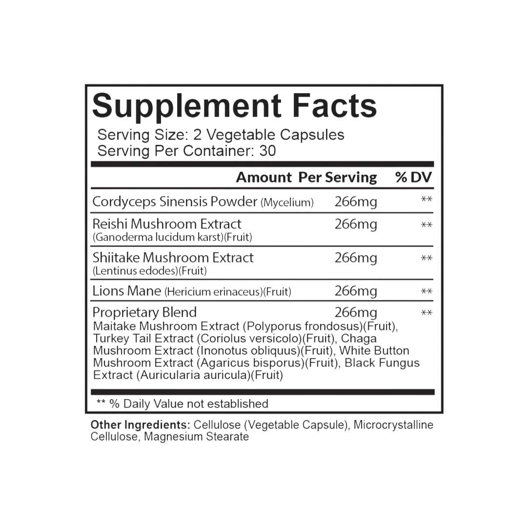 Cordyceps Sinensis, Reishi, Shiitake, Lion’s Mane, Maitake, Turkey Tail, Chaga, White Button, and Black Fungus come together in a synergistic formula that supports multiple aspects of health. Each mushroom contributes unique benefits ... from immune system support to cognitive enhancement.