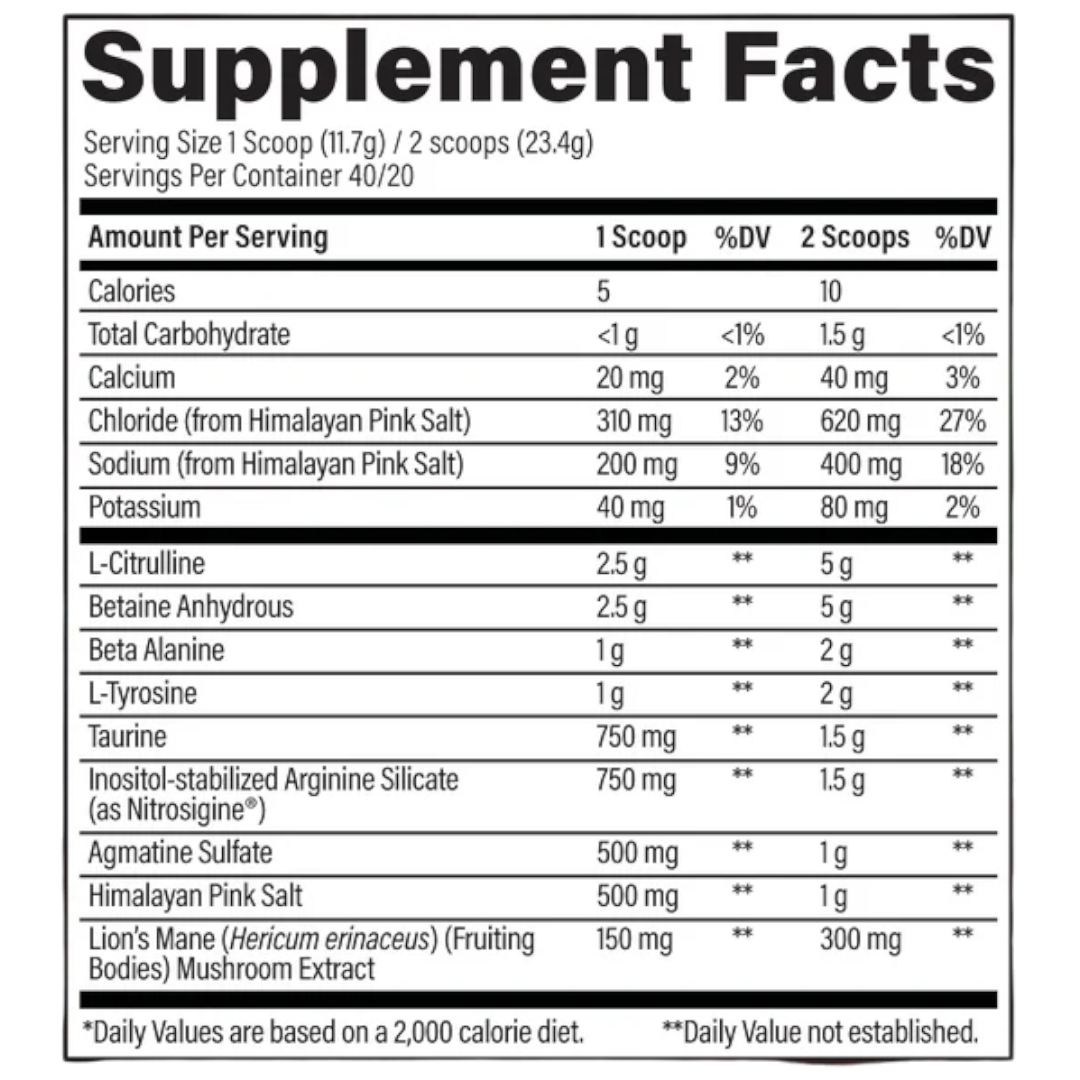 Featuring a potent blend of Nitrosigine® (bonded Arginine Silicate), L-Citrulline, L-Taurine, Himalayan Pink Salt, and 150mg Lion’s Mane ... this formula supports enhanced blood flow, muscle pumps, and workout performance—without caffeine. Perfect for night-time lifters or those sensitive to stimulants ... RAW Pump delivers clean, effective results.