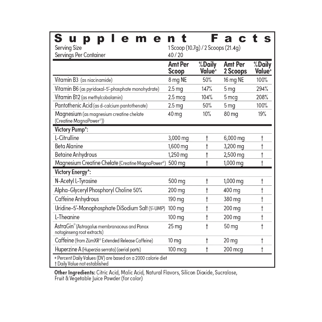 Victorious is a premium pre-workout designed for those who want more than just energy — it’s for athletes and driven individuals who want to train with focus, clarity, and consistency. By combining key performance ingredients with nootropic support ... Victorious helps sharpen your mental edge while fueling your body for high-effort workouts.